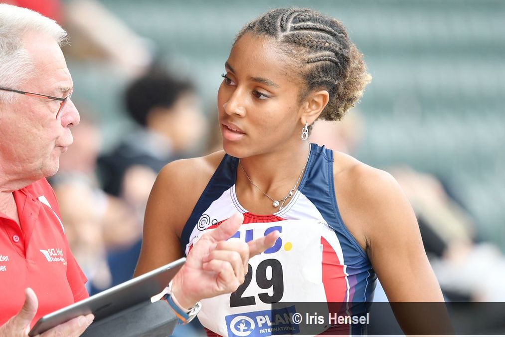 - Yemisi Ogunleye (MTG Mannheim) mit Trainerin Iris Manke-Reimers