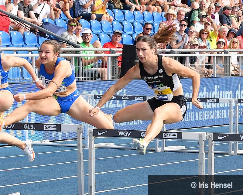 Dort erwischte Ricarda Lobe erneut einen exzellenten Start und lief das Rennen flüssig und konzentriert zu Ende. Mit einer Zeit von 12,89 Sekunden krönte sie sich mit dem Deutschen Meistertitel und verbesserte zugleich ihre persönliche Bestleistung von vor sechs Jahren um eine Hundertstelsekunde. Rosina Schneider (TV Sulz) kam auf den zweiten 50 Metern stark auf. Nach einem kleineren Fehler an der vorletzen Hürde strauchelte sie jedoch beim Überlaufen der letzten und wurde mit 13,08 Sekunden sichtbar enttäuscht Dritte.