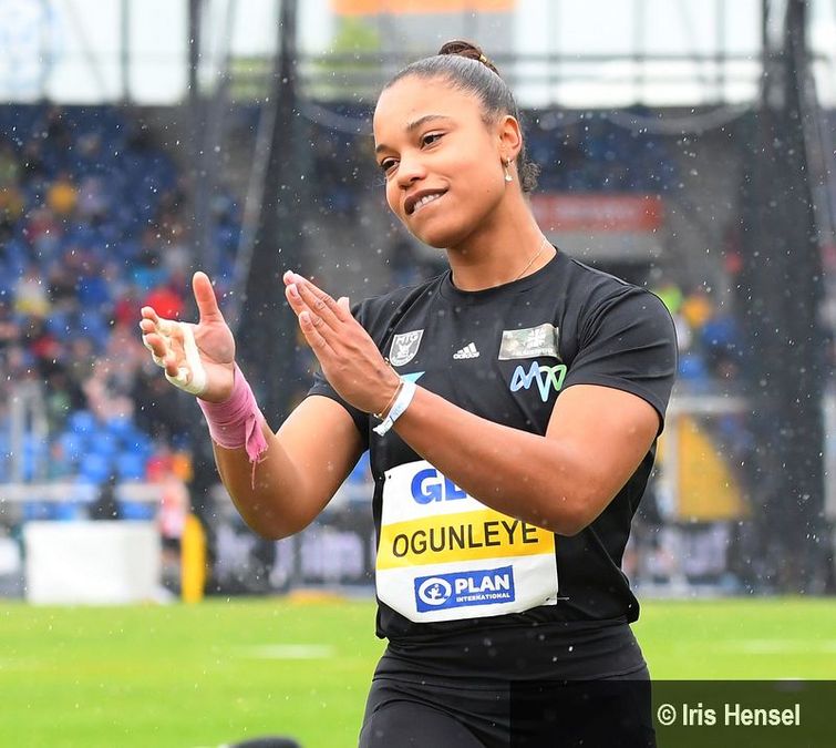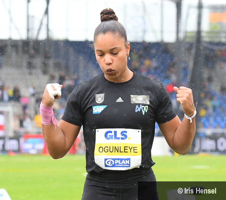 Yemisi Ogunleye (MTG Mannheim) jubelte im dritten Versuch ihrer Kugel hinterher, denn dass dieser Stoß weit gehen würde, hatte sie gleich gemerkt. Mit 19,15 Metern übernahm sie deutlich die Führung in einem Wettkampf, in dem alle Starterinnen nur für ihre jeweiligen Versuche unter dem Regenschutz hervortraten. Ebenfalls im dritten Durchgang zeigte Alina Kenzel (VfB Stuttgart 1893), dass man mit ihr rechnen musste, wenn es um die Medaillenplatzierungen ging. 18,48 Meter waren ihre beste Weite an diesem Tag und bescherten ihr den Bronze-Rang. Für Nina Ndubuise (SG Schorndorf 1846; 17,41 Meter) und Lea Riedel (VfB Stuttgart 1893; 16,99 Meter) wurden es am Ende die Plätze fünf und sechs. Yemisi Ogunleye setzte dagegen mit ihrem fünften Stoß noch einen obendrauf und gewann mit einer Weite von 19,25 Meter den Deutschen Meistertitel.