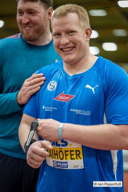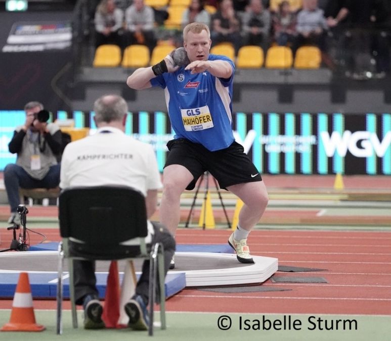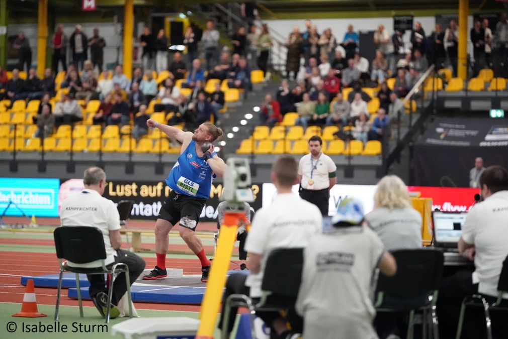 Der Freitagabend in der Helmut-Körnig-Halle begann mit dem Kugelstoßen der Männer. Der Deutsche Meistertitel geht an Eric Maihöfer vom VfL Sindelfingen mit einer Weite von 20,37 Meter. Eric erreichte dabei mit drei gültigen Versuchen nicht nur den ersten Platz, sondern auch eine neue persönliche Bestleistung sowie die Leistungsbestätigungsnorm für einen Start bei der Hallen-EM. Die Silbermedaille geht ebenfalls an einen Athleten aus Baden-Württemberg, nämlich Silas Ristl, ebenfalls vom VfL Sindelfingen. Er wuchtete seine 7,26 Kilogramm schwere Kugel auf 19,68 Meter. Knapp am Siegertreppchen vorbei schrammte Tizian Lauria (VfL Sindelfingen) und wurde Vierter. Sein bester Versuch landete bei 19,10 Meter, außerdem gelang ihm damit eine neue Saisonbestleistung. Direkt dahinter auf Platz 5 lag Simon Bayer vom LAC Essingen. Simon hatte etwas Pech und hatte nur einen gültigen Versuch. Der eine gültige Versuch war 19,03 Meter weit. Ebenfalls Pech hatte leider Lasse Schulz vom TV Plieningen. Lasse gelang auch nur ein gültiger Versuch. Seine Kugel flog auf 17,26 Meter und brachte ihn auf Platz 12.