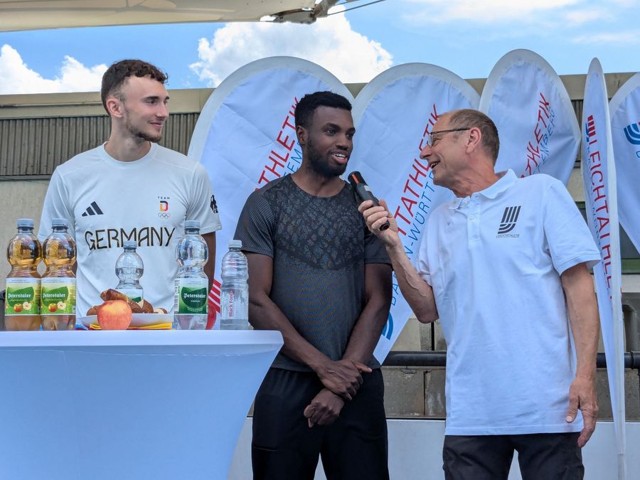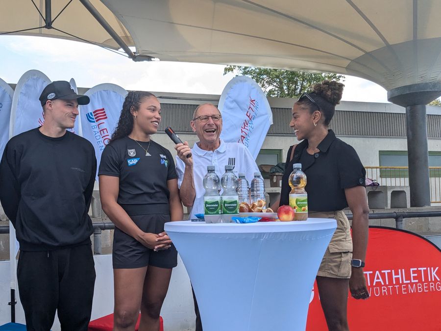 Michael Schlicksupp, Präsident des Badischen Leichtathletik-Verbandes, begrüßte die Athlet:innen, Trainer:innen und Medienvertreter:innen mit den Worten „Olympische Spiele sind etwas ganz Besonderes – Wir freuen uns für und mit euch, dass ihr mit dabei seid und wir euch heute hier gute Wünsche mit auf den Weg nach Paris geben können“. In einer kurzen Gesprächsrunde erzählten die Athlet:innen von ihren Vorbereitungen und Erwartungen für die Olympischen Spiele. Mikaelle Assani: „Ich glaube, jedes kleine Kind träumt davon, mal auf der ganz großen Bühne zu stehen. Ich bin unglaublich dankbar, dass ich das jetzt schon erleben darf. In Rom (Anm.: Leichtathletik-EM 2024 in Rom (Italien)) konnte ich um Medaillen mitspringen – das stärkt einen nochmal. Ich bin gewappnet für die Olympischen Spiele“. Auch die weiteren Athlet:innen zeigten sich bestens vorbereitet und motiviert für herausragende Leistungen im Stade de France. Beim Ziel für Paris waren sich alle einig: Das Finale der besten Acht erreichen zu wollen.