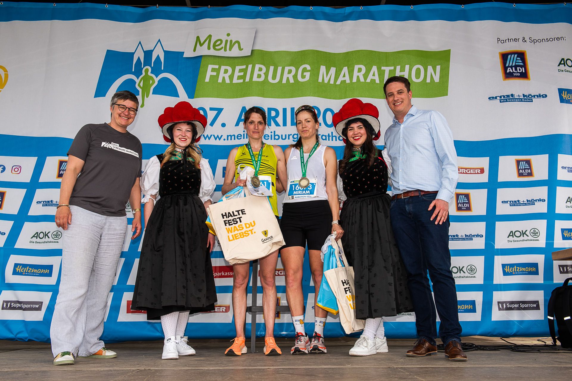 Um 09.30 Uhr gab Bürgermeister Stefan Breiter den Startschuss für die ersten Läufer:innen auf der Marathonstrecke und des Super Sparrow Halbmarathon. Mit einer Zeit von 2:43:47 lief Latifa Mokhtari vom asgw bei den Marathonläuferinnen als Erste ins Ziel. Anja Röttinger vom LAC Freiburg und Siegern der letzten beiden Jahre, wurde mit einer Zeit von 2:43:51 Zweitplatzierte: „Heute war es der zweite Platz. Es geht mir beim Laufen nicht um die Leistung, sondern darum, dass man das was man liebt, für sich nie ganz aufgibt. Ich habe heute das gemacht, was ich liebe und nicht aufgegeben.“ Als Dritte überquerte Svenja Erdmann mit einer Zeit von 3:12:13 die Ziellinie.