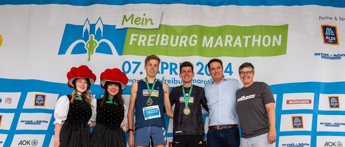 Bei den Herren konnte Omar Tareq von den Lauffreunden Freiburg mit einer Zeit von 2:25:30 die Marathondistanz für sich entscheiden: „Ich war schon ein paar Mal in Freiburg mit dabei, aber nicht beim Marathon. Mein Lauf war gut, ich freue mich über den Sieg und bin glücklich, im Ziel zu sein.“ Als Zweitplatzierter kam Fritz Koch (2:33:51) von Drescher Running Outdoor, 2023 bereits auf Platz zwei der Marathondistanz, mit Kreislaufschwierigkeiten ins Ziel, konnte aber zur Siegerehrung wieder lächeln. Drittplatzierter bei den Herren wurde Clemens Fox (2:36:24) von Drescher Running Outdoor / PHWE Xc Team.