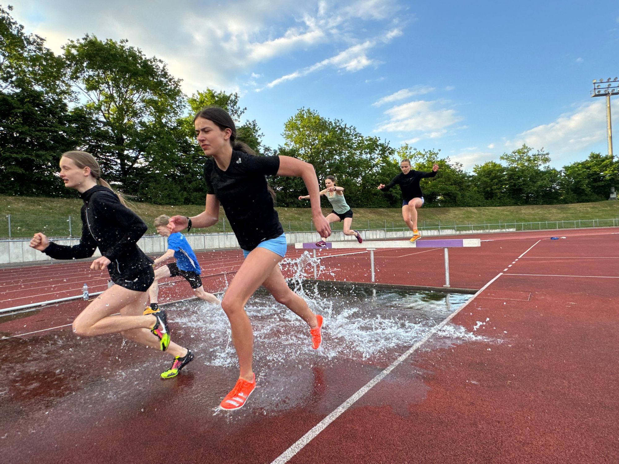 Ein wesentlicher Leistungsfaktor beim Hindernislauf ist neben der Hindernisüberquerung das schnelle und effiziente Überlaufen des Wassergrabens. Und genau die stand beim Wassergraben-Training am gestrigen Mittwoch (7. Mai) am Bundesstützpunkt in Stuttgart im Fokus. Sechs Athlet:innen waren der Einladung der beiden Landestrainer Christoph Thürkow und Jens Boyde gefolgt und übten fleißig am Wassergraben direkt und als Vorübung mit einem Balken an der Weitsprunggrube.
